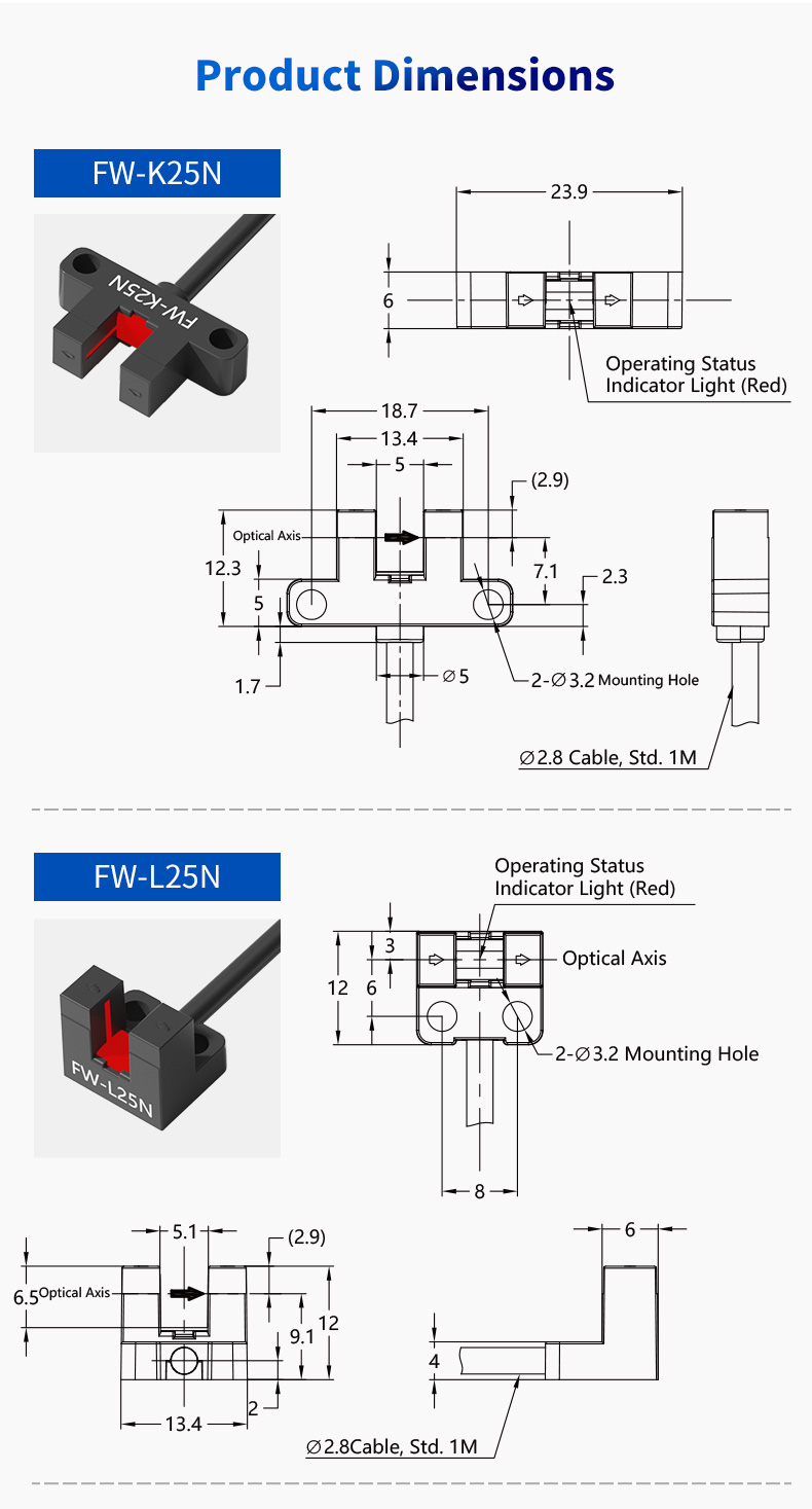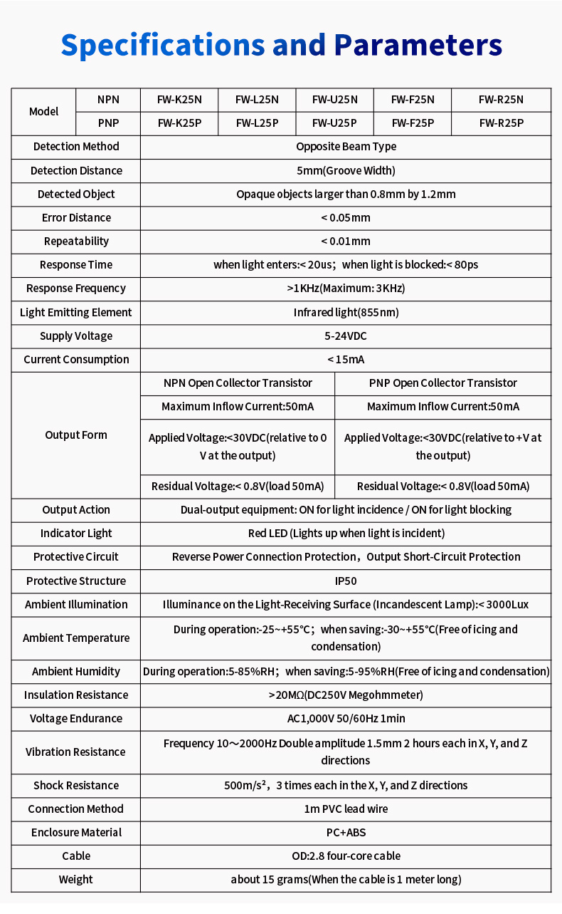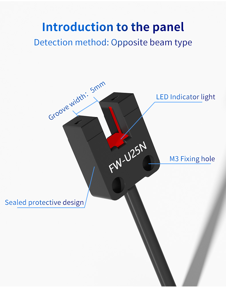 В требовательном мире промышленной автоматизации надежность и точность — это не просто характеристики, а необходимость. Фотоэлектрический датчик серии FW25 с U-образным пазом разработан для удовлетворения этих критических требований, предлагая непревзойденную точность и долговечность для широкого спектра измерительных приложений. Благодаря стандартизированной ширине обнаружения U-образной канавки 5 мм этот датчик является идеальным решением для инженеров и системных интеграторов, которым требуется стабильная производительность при обнаружении небольших компонентов, точном позиционировании и управлении движением.