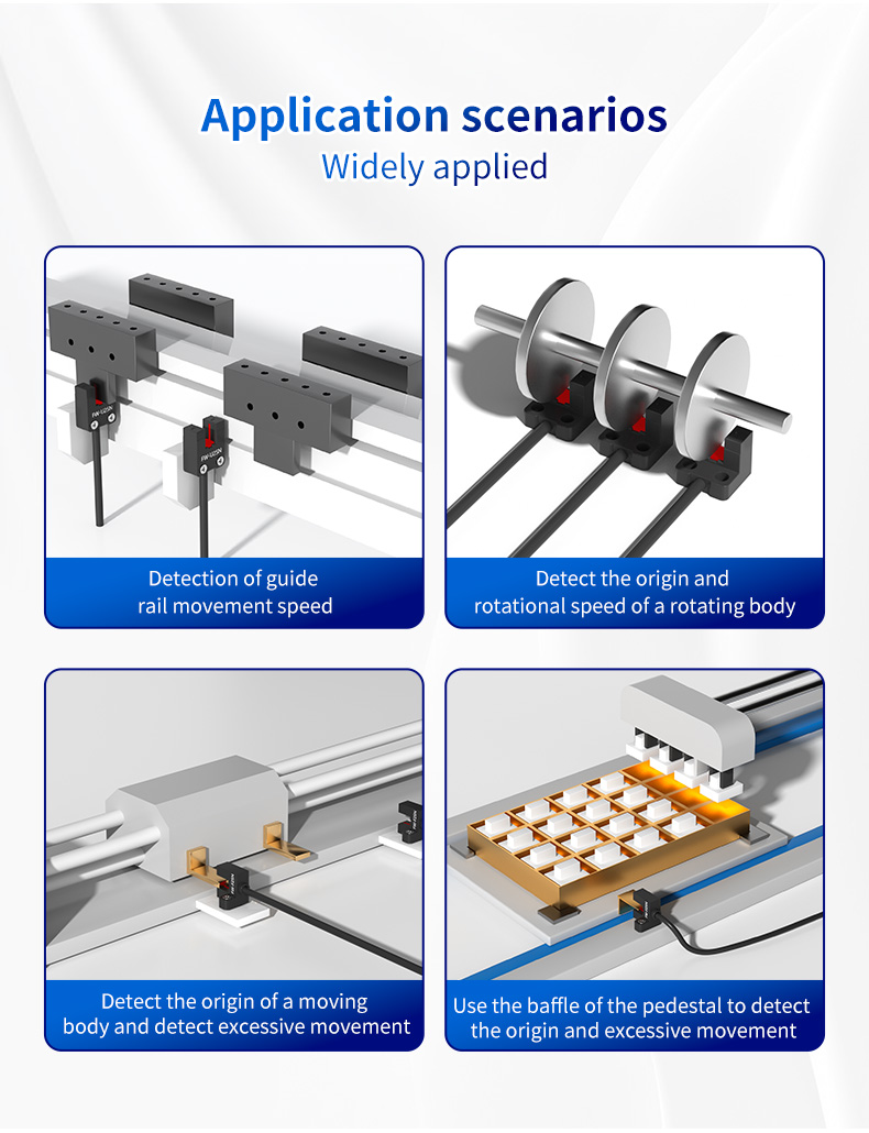 Универсальность датчика U-образного паза FW25 делает его незаменимым компонентом во многих отраслях промышленности, включая упаковку, погрузочно-разгрузочные работы, обработку на станках с ЧПУ и автоматизацию сборки. Определение скорости движения направляющей: в системах линейного перемещения флажок, установленный на движущейся каретке, может проходить через U-образный паз. Подсчитывая импульсы с течением времени, FW25 может точно рассчитать линейную скорость направляющей, обеспечивая контроль и управление скоростью. Обнаружение начала координат и перебега движущегося тела: датчик идеально подходит для последовательностей возврата в исходное положение. Выступ на линейном приводе или манипуляторе робота проходит через паз, обеспечивая контроллеру точный сигнал «исходное положение» или «исходное положение». Кроме того, в конце хода можно разместить второй датчик для обнаружения превышения хода, предотвращения механических повреждений и обеспечения эксплуатационной безопасности. Определение начала координат и скорости вращения вращающегося тела: установите один выступ или многозубое колесо на вращающийся вал. Когда каждый выступ проходит через канавку диаметром 5 мм, FW25 генерирует импульс. Один импульс на оборот предоставляет исходные данные, а несколько импульсов позволяют точно рассчитать скорость вращения (об/мин), что важно для управления двигателем и мониторинга процесса. Использование с перегородками монтажного кронштейна для позиционирования: во многих системах используются простые фиксированные перегородки. FW25 можно использовать в сочетании с монтажным кронштейном или специальными приспособлениями для определения наличия или положения этих перегородок, создавая простую и экономичную систему концевых выключателей.
