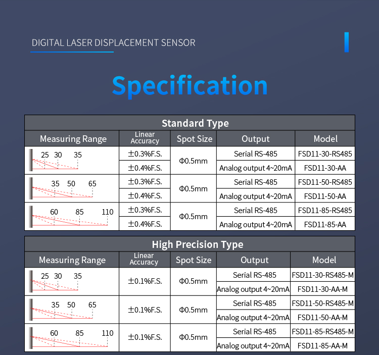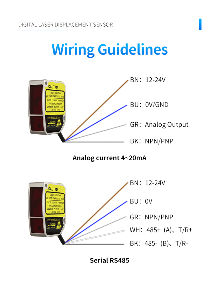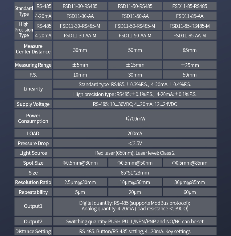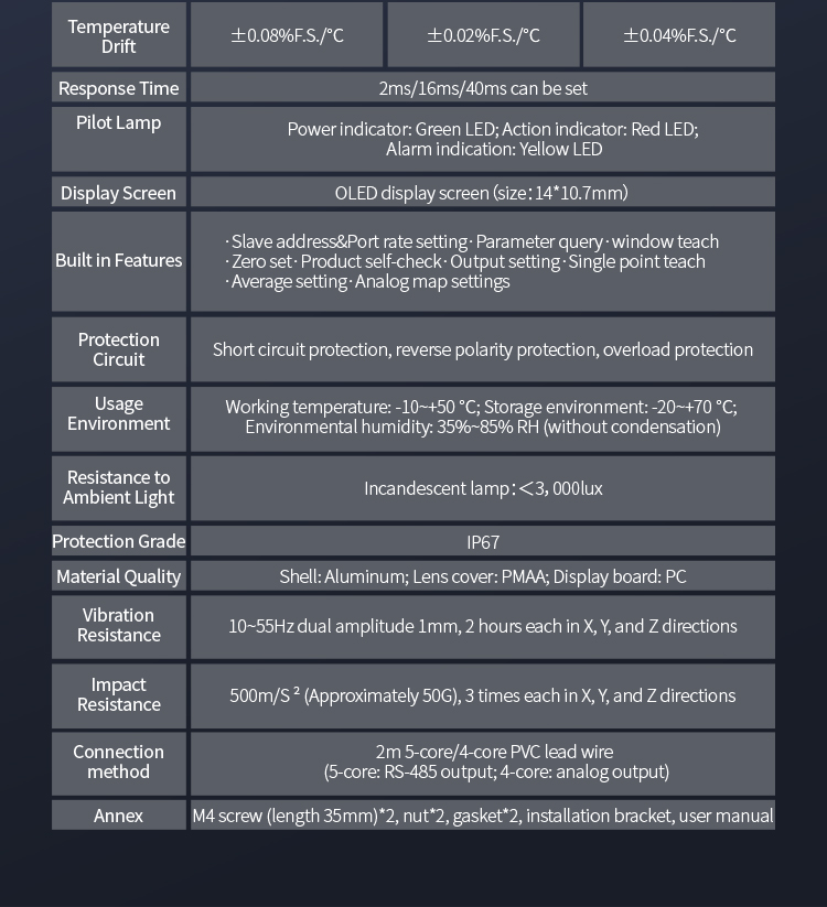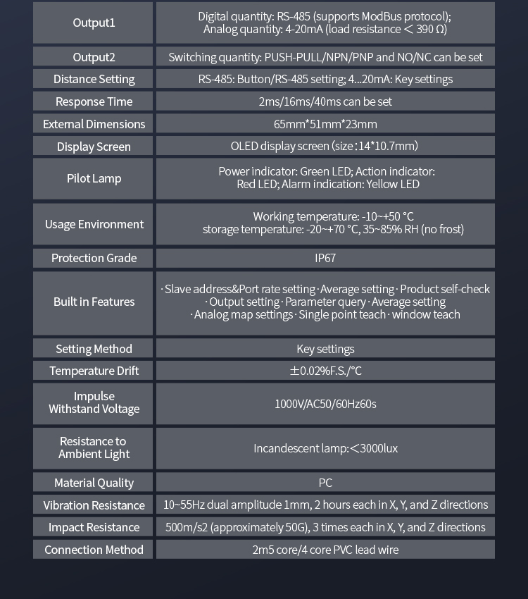 Настройка двойной кнопки позволяет гибко выбирать диапазон от 10 до 850 мм с переключаемым выходом и аналоговым токовым выходом, а также выходом связи RS485, что позволяет удовлетворить различные потребности использования.