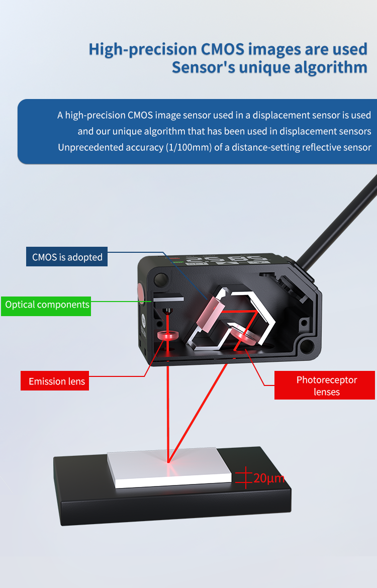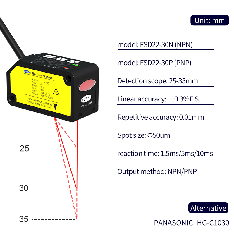 Прорыв в базовой технологии: точность поднимается на новую высоту В серии FSD22 используются высокоточные CMOS-датчики изображения в сочетании с запатентованными базовыми алгоритмами Fuwei Electronics, что обеспечивает технологический прорыв в области отражающих датчиков с регулировкой расстояния: точность достигает поразительной 1/100 мм, что значительно превосходит характеристики традиционных датчиков. Уникальная алгоритмическая обработка обеспечивает стабильные и надежные данные измерений в различных условиях, сохраняя исключительную стабильность обнаружения даже на отражающих поверхностях или сложном фоне.