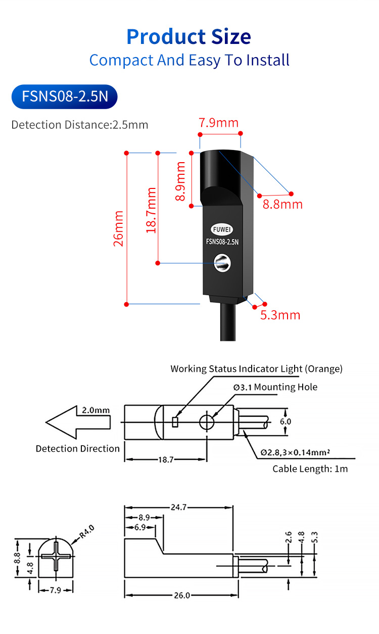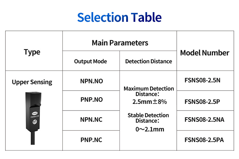 Независимо от того, требуется ли для вашего приложения точное позиционирование металлического лотка, надежное обнаружение рамки диска, точное обнаружение прохождения монет или обнаружение критического кулачка, FSNS08-2.5N — это универсальное и надежное решение, на которое вы можете положиться. Продолжайте читать, чтобы изучить подробные характеристики и узнать, как этот датчик может оптимизировать ваши процессы автоматизации.