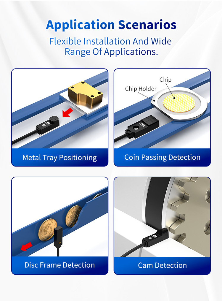 Надежный набор функций FSNS12D-04N делает его исключительно универсальным в широком спектре отраслей: Позиционирование металлического лотка: Обеспечивает точное определение местоположения в автоматизированных системах хранения и поиска (ASRS) и для управления AGV. Обнаружение рамки диска: Обеспечивает надежное определение присутствия держателей дисков в производстве полупроводников и сборке электроники. Обнаружение прохождения монет: Обеспечивает точный подсчет и проверку в торговых автоматах, игровых автоматах и финансовых центрах. киоски. Обнаружение камер: отслеживает положение, скорость и время кулачков в автоматизированном оборудовании и поворотных индексаторах для точного последовательного управления.