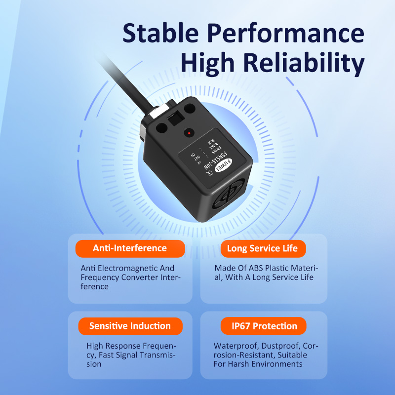Точное расстояние обнаружения 10 мм. Серия FSNS18-10 обеспечивает стабильную и надежную возможность бесконтактного обнаружения на расстоянии 10 мм. Это расстояние точно откалибровано для эффективного захвата целевых объектов, избегая при этом случайного контакта и повреждения, что делает его особенно подходящим для установки в условиях ограниченного пространства. Расширение возможностей интеллектуального чипа: в отличие от обычных датчиков, этот продукт оснащен встроенным интеллектуальным чипом обработки. Этот «мозг» выполняет анализ и компенсацию сигнала обнаружения в режиме реального времени, эффективно противодействуя электромагнитным помехам окружающей среды и обеспечивая стабильный и последовательный выходной сигнал. Это приводит к быстрому и безошибочному реагированию, будь то обнаружение быстродвижущихся частей или крошечных металлических компонентов, что значительно снижает количество ложных срабатываний и пропущенных обнаружений.
