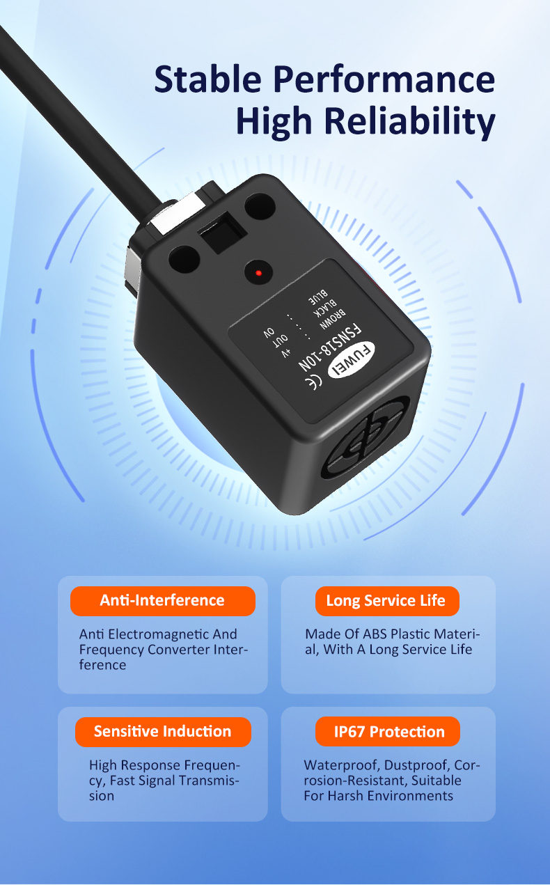 Китай Квадратный индуктивный датчик приближения FSNS18-10N Поставщик, Производитель - Прямая цена с завода - Fuwei Квадратный индуктивный датчик приближения FSNS18-10N В современной промышленной автоматизации, где эффективность и точность имеют первостепенное значение, надежное обнаружение каждого компонента является краеугольным камнем бесперебойной работы. Квадратный датчик приближения серии FSNS18-10 от Fuwedi Electronics является лучшим решением, разработанным для этой важной задачи. Это больше, чем просто датчик, он действует как «интеллектуальный агент восприятия» на вашей производственной линии. Благодаря стабильному расстоянию обнаружения 10 мм, встроенному интеллектуальному чипу и долговечности военного уровня он широко применяется в таких отраслях, как станкостроение, текстильная промышленность, логистика и авторемонт, с целью повышения интеллекта и производительности вашего оборудования.